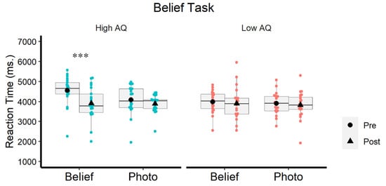 The following supporting information can be downloaded at: https://www.mdpi.com/article/10.3390/brainsci12010030/s1, Figure S1: Reaction times in the belief tasks, in the high-AQ group (left) and the low-AQ group (right) in response Modality and Test (pre- and post-test); Figure S2: Accuracy in the belief tasks, in the high-AQ group (left) and the low-AQ group (right) in response Modality and Test (pre- and post-test); Table S1: Reaction times ANOVA: Group × Test × Response Polarity × Modality; Table S2: Accuracy ANOVA: Group × Test × Response Polarity × Modality