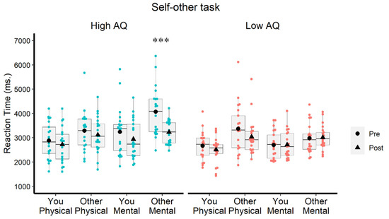 Self-other judgment task. In this task, the design included 2 Test (Pre-test vs. Post-test) × 2 Reference (You vs. Other) × 2 Feature (Mental vs. Physical) as within-participant factors and 2 Group (high-AQ vs. low-AQ) as between-participant factor. Two sets of self-other questions were adapted from an earlier version used by []. Participants were asked to make mental or physical judgments about themselves or a famous person (Lady Gaga and Leo Messi, presented in a counterbalanced order in the two test sessions). At the beginning of the assigned set, they read a short biography of the famous person and were told that they would be asked to rate the likelihood that such person (the other) or the participant (you) had certain physical (stature, hair color, etc.) or mental features (opinions, likes and dislikes). For example, a ‘’you-physical’’ judgment could be ‘’How likely are you to be muscular?’’, whereas an ‘’other-mental’’ judgment could be ‘’How likely is she to enjoy the adrenaline rush of taking risks?’’. Before each trial, the label ‘’YOU’’ or the famous person’s name (“LADY GAGA” or “LEO MESSI”) appeared on the screen for 2 s (letter size 45 pt), to establish the reference for the incoming question. The RTs were collected to be used as the dependent measure. In this task, there were no accuracy measures since correctness criteria were not applicable.
