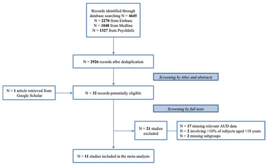 Our search generated 4645 records from selected electronic databases (1048 from Medline, 2270 from Embase, and 1327 from PsycInfo). After removing duplicates, 2926 articles were identified. The preliminary screening of titles and abstracts identified 32 potentially eligible articles, including also an additional study retrieved in Google Scholar. According to the final eligibility assessment of full texts, 11 studies were included [,,,,,,,,,,], while 21 studies did not meet inclusion criteria. We benefited also from additional, unpublished data provided by the authors of two studies [,].
