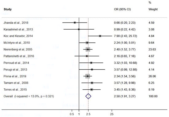 The random-effects meta-analysis, including 11 studies [,,,,,,,,,,] based on 2734 individuals with BD, showed that individuals with both BD and ADHD (n = 516) had higher rates of AUD as compared with subjects with BD only (n = 2218) (arcsine transformed proportions: 34.0% [95% CI: 21.7 to 47.4%] vs. 18.3% [95% CI: 10.1 to 28.4%]). The estimated OR was 2.50 (95% CI: 1.91 to 3.27; I2 = 13.0%) (Figure 2). Meta-regression analyses showed that study-level characteristics did not influence the effect size (Table 2). The Egger’s test did not estimate any risk of publication bias (p = 0.91). Finally, intragroup analysis, based on four studies [,,,] and 163 individuals with both BD and ADHD, showed no differences in AUD rates between current (adult) and past (childhood) ADHD (OR: 1.86; 95% CI: 0.71 to 4.89; I2 = 0%).
