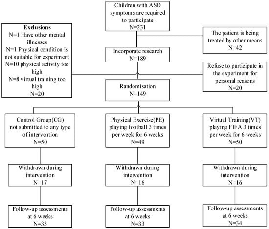 All children with ASD were randomly divided into VT, PE and CG groups. Among them, the intervention method adopted by for the VT group was VT (three times a week, one hour each time). The experiment adopted VR intelligent classroom, with the experiment carried out on with football game FIFA21, an interactive combination of man and machine. The intervention mode of the PE group was football training (three times a week, one hour each session). Children with ASD in the CG group did not receive VT or PE but only received psychological counseling. In this study, no compensation measures were taken. The study was approved by the Ethics Committee of Northeastern University. The study procedure was in accordance with the ethical standards of the institutional and national research committee and with the 1964 Helsinki Declaration and its later amendments or comparable ethical standards.