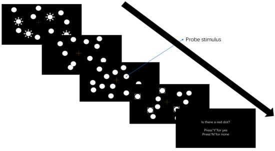 The test used a computer with black background (screen size: 800 × 600 pixels). The material consisted of 12 white rings (the outer diameter of the ring was 40 pixels, and the inner diameter was 38 pixels), and the probe stimulus was a solid red circle with a diameter of 8 pixels. The relevant test procedures are shown in Figure 2.