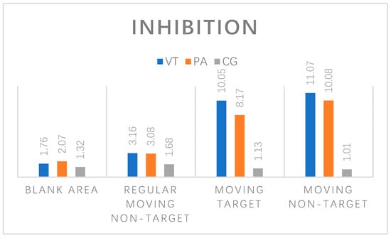 In this test, the inhibition of VT group was: blank area, 1.76%; regular moving non-target, 3.16%; moving target, 10.05%; moving non-target, 11.07%. The inhibition of the PE group was: blank area, 2.07%; regular moving non-target, 3.08%; moving target, 8.17%; moving non-target, 10.08%. The inhibition of the CG group was: blank area 1.32%; regular moving non-target, 1.68%; moving target, 1.13%; moving non-target, 1.01%. Pre-test and post-test independent sample t-test in the VT group showed that the detection rate of moving target and non-moving target was significantly different (p < 0.05), but there was no significant difference in the other two regions. Pre-test and post-test independent sample t-test in the PE group showed that the detection rate of moving target and non-moving target was also significantly different (p < 0.05). Pre-test and post-test independent sample t-test in the CG group showed that there was no significant difference in the detection rate of probe stimulus in the region where detection rate appeared. The relevant comparison results of inhibition are shown in Figure 3.