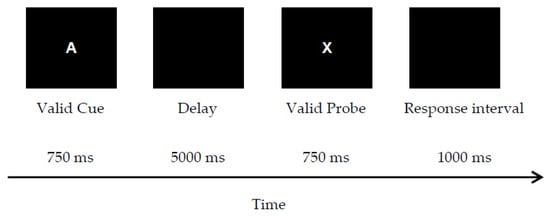Letter-cue AX-CPT. The letter-cue AX-CPT modeled previous work []. The rule was to press a “target” key to respond to a valid probe (letter X) only when it followed a valid cue (letter A). Invalid cues and probes were all other letters of the alphabet except for K, V, and Y due to their visual similarity to X. All letter stimuli were uppercase, in 36-point bolded white Helvetica font, presented centrally against a black background on a computer monitor. The letter stimuli were sequentially presented one at a time, including the four types of cue-probe pairs. Each cue was presented (750 ms), followed by an unfilled delay (5000 ms). Then, a probe was presented (750 ms), followed by a 1000-ms inter-trial interval (ITI). The response time window was 1750 ms (i.e., probe + ITI). The trial procedure for a target trial is illustrated in Figure 1.