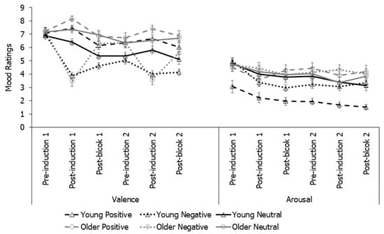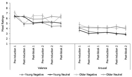 Taken together, the results suggested successful mood induction. Negative mood induction did reduce the valence ratings for both age groups and at both induction time points. Despite an initial drop, arousal ratings did not vary by mood induction conditions.