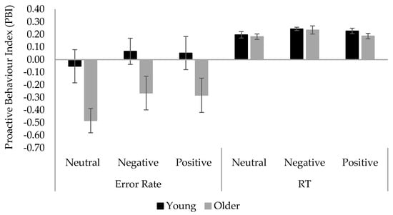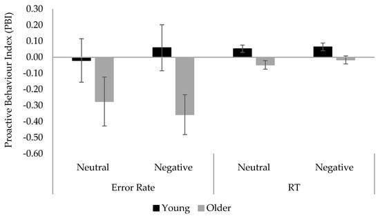 Mean Proactive Behavior Index (PBI) in error rate and RT across age and mood conditions in Experiment 2. Error bars denote standard error.