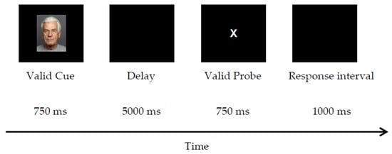 Trial procedure. The trial procedure and structure modeled Experiment 1 (Figure 4), except the cue stimuli were faces instead of letters. What constituted a valid cue was based on gender classification (either male or female faces as valid cues). Specifically, the valid cues were male faces in one block (valid-male) and female faces in the other block (valid-female). This was to control for potential gender preference or practice effects related to the specific mapping between a gender and the cue identity. The order of the two blocks was counterbalanced across participants. A target response was required to the letter X (valid-probe) only if it followed a valid face cue (female or male in each block). Cue-lure trials consisted of a valid face cue followed by an invalid letter probe. Probe-lure trials consisted of an invalid face cue followed by a valid-letter probe “X”. Control trials consisted of an invalid face cue followed by an invalid letter probe.