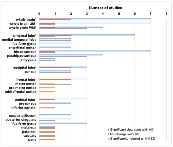Studies report significant decreases in magnetization transfer ratio (MTR) and/or histogram peak height related to Alzheimer’s disease (AD) and mini-mental state examination (MMSE) in a variety of different brain regions, most of which are included in this figure. For the two studies which have analyzed only mild cognitive impairment (MCI) subjects, significant decreases in MTR vs. controls are also included. (* numbers include both MTR and histogram peak heights. Peak heights are more sensitive to changes, and some studies report both a significant decrease in peak height and non-significant change in MTR in the same region). GM—gray matter; WM—white matter.