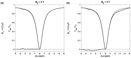 Simulated z-spectrum and MTR asymmetry (MTRasym). Dashed line contains contributions from water and magnetization transfer (MT). Solid line contains additional contributions from amide, glutamate, guanidine, myo-inositol (a,b), as well as from nuclear Overhauser effect (NOE) (b). Corresponding MTRasym plots are located in the bottom left corner of both plots. Most of the CEST peaks are either too small, or too close to the water peak to be easily visible at 3T magnetic field (B0), but the amide peak at 3.5 ppm is quite clearly seen here. B1—the amplitude of saturation radiofrequency pulse; S0—signal without saturation; Ssat—signal with saturation; Δω—frequency offset in reference to water resonance.