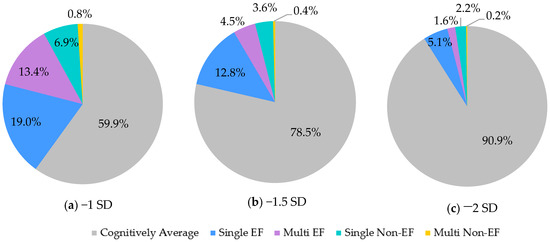 PD-MCI subtype breakdown by actuarial criteria cutoffs. (a–c) Depict the percentages of the sample that fall into each MCI subtype based on the respective SD cutoff. EF = Executive Function.