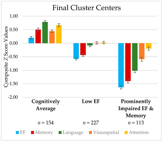 Results of the K-means cluster analysis supported the existence of three clusters. Cluster membership was stable after 10 iterations. None of the clusters were unacceptably small. Visual inspection of the cluster centers (Figure 2) revealed a group with average cognition across all domains (n = 154), a group with low executive function (Low EF) (n = 227), and a group with executive function and memory impairments, as well as low language scores (Prominently Impaired EF/Memory) (n = 113).