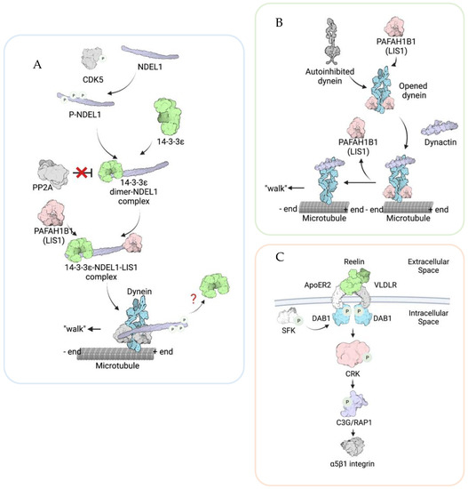 Schematic diagrams illustrating the molecular mechanisms of PAFAH1B1 (LIS1), CRK, and 14-3-3ε in regulating neuronal migration. (A) Phosphorylated NDEL1 (NUDEL) protected by 14-3-3ε from dephosphorylation. NDEL1 is phosphorylated by CDK5. Once phosphorylated, 14-3-3ε interacts with NDEL1 and protects it from the protein phosphatase 2 (PP2A)-mediated dephosphorylation. Therefore, NDEL1 could stay activated. Active NDEL1 transiently interacts with PAFAH1B1 (LIS1) and helps PAFAH1B1 (LIS1) bind to dynein, therefore promoting the movement of dynein along microtubules (MTs). However, it is unclear whether 14-3-3ε stays with dynein in the MTs. (B). PAFAH1B1 (LIS1) promotes dynein “open” conformation. When dynein is in an autoinhibited state, it has a low microtubule on rate and a reduced ability to bind to dynactin. PAFAH1B1 (LIS1) binds to “open” state dynein and stabilizes dynein at the “open” state. This allows dynein to stay at a high microtubule-binding status. Afterward, PAFAH1B1 (LIS1) dissociates from the dynein–dynactin complex. In this way, PAFAH1B1 (LIS1) promotes microtubule mediate migration by regulating dynein function. (C) CRK plays an essential role in the Reelin signaling cascade. Reelin pathways are activated by Reelin interacting with the transmembrane Reelin receptors, ApoRE2, and VLDLR. This triggers the phosphorylation of Dab1 by SFK at the inner leaflet of the plasma membrane. DAB1 then recruits CRK and activates CRK by phosphorylation. Activated CRK promotes the activation of the Crk SH3-binding guanine nucleotide-releasing/exchange factor (C3G)/Ras-proximate-1 (RAP1) pathway, which activates the cell matrix adhesion molecule α5β1 integrin, thus promoting cell migration. The illustrations were created with BioRenders.com (7 December 2021).
