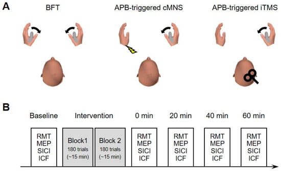The general experimental conditions and time course are shown in Figure 1. This study had a counterbalanced crossover design which consisted of three experimental sessions with different interventions—(1) bilateral finger movement training (BFT) involving bilateral thumb abduction; (2) electromyographic (EMG) activity of the right abductor pollicis brevis (APB)-triggered TMS of the ipsilateral M1 (APB-triggered i-TMS); and (3) EMG activity of the right APB-triggered contralateral median nerve stimulation (APB-triggered c-MNS) (Figure 1A). The intervention consisted of two blocks that lasted for 15 min each (see Section 2.6. for details). A break period of 5 min was interposed between the blocks. The outcome measurements were performed before (baseline), immediately after (at 0 min), and 20, 40, and 60 min after the intervention (Figure 1B). Each session lasted for approximately 2 h and it was performed on separate days with a gap of at least 1 week between the sessions.