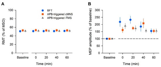 The averaged data of the resting motor threshold (RMT) (A) and amplitude of the motor-evoked potential (MEP) (B) in all the participants. The RMT is expressed as a percentage of the maximum stimulator output (MSO). The MEP amplitude is expressed as a percentage of the baseline value. Each plot and error bar represents the mean and standard error of the mean, respectively.