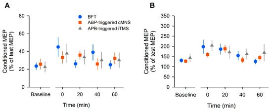 The SICI group data are shown in Figure 3A. The two-way ANOVA yielded a significant effect of time (F (4, 44) = 3.84, p =0.009, ηp2 = 0.259, 1 − β = 0.861), but no effect of intervention (F (2, 22) = 0.03, p = 0.98, ηp2 = 0.002, 1 − β = 0.053) or interaction (F (8, 88) = 1.82, p = 0.08, ηp2 = 0.142, 1 − β = 0.74). The results of the post hoc test showed that SICI significantly decreased at 0 min post-intervention in the BFT (p = 0.01). In the APB-triggered i-TMS protocol, SICI decreased significantly at 0 min post-intervention (p = 0.01) compared to that at baseline. There was no significant difference in SICI over time in the APB-triggered c-MNS protocol (p = 0.61).