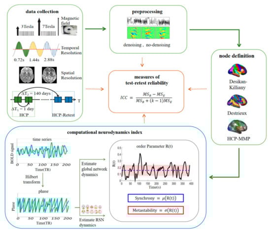 An overview of the workflow is shown in Figure 1. To examine the stability of synchrony and metastability in the fMRI signals, and to analyze the influences of different factors on test–retest reliability (the green boxes in Figure 1), we extracted the mean time series for each node from the preprocessed data of all subjects, subsequently calculated synchrony and metastability in the global network and different resting-state networks, and their stabilities were measured.