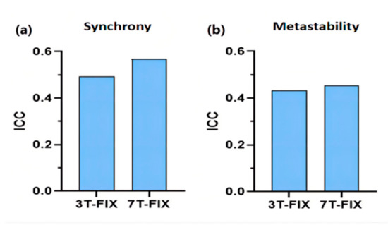 Overall, for reliabilities of synchrony and metastability, images acquired at 7T-FIX had higher reliability than images acquired at 3T-FIX. These results are in correspondence with the findings of Tak et al. which showed that 7T data have a high reproducibility of effective connectivity [69]. In particular, a higher field strength would enhance the signal-to-noise ratio (SNR), the contrast-to-noise ratio (CNR), and the spatial resolution, as well as it would increase the blood oxygen level dependent (BOLD) effect, making the signal changes in brain function imaging more obvious [45,69,70,71]. Our result suggests that synchrony and metastability achieve fair levels of consistency in describing spontaneous brain activity, and that the reliabilities of synchrony and metastability are better at higher field strengths.