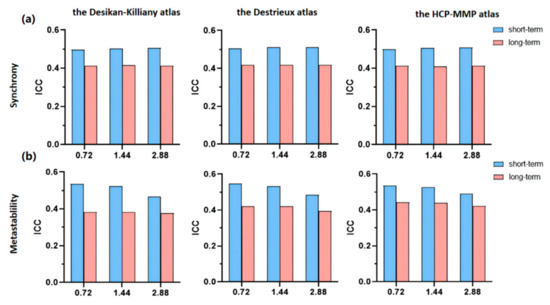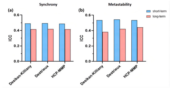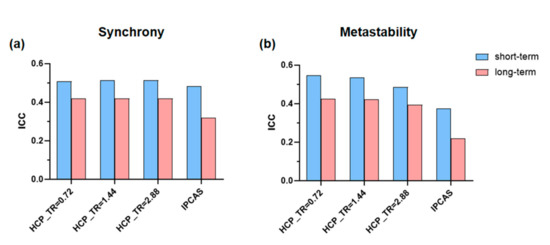 In this paper, we observed that short-term analyses showed higher test–retest reliability than long-term analyses with synchrony and metastability, and both showed fair reliability. This result agrees with previous findings that the spatial patterns of functional networks were more reliable in short-term scans [90]. It may be explained by the fact that short-term scans may have reduced internal noise with improved reliability estimates and that short-term scanning intervals can result in more stable and accurate values [52,91]. Individual opposite results may be largely attributed to its own poor stability. Our finding here suggests that the scanning interval may affect synchrony and metastability, which needs to be considered in the experimental design of future studies.