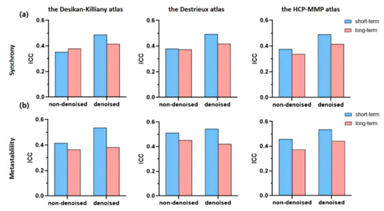 We found that the synchrony and metastability of denoising data generally demonstrated fair test–retest reliability. The fMRI signal is affected by many sources of fluctuations, which are collectively referred to as the “noise” components, including effects of motion, non-neuronal physiology, scanner artifacts, and other nuisance sources. This reduces the signal-to-noise ratio, and can mislead statistical analyses attempting to investigate neuronally related brain activation [61,62]. At present, denoising will not alter the information on the neural activity dynamics in the brain [77], suggesting that denoising data may be more suitable for research using neurodynamic indexes.