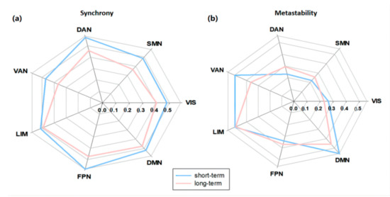 We visualized the values of reliable ICCs for each of those seven networks of the Destrieux atlas for synchrony and metastability as spider graphs in Figure 7. In the short term, the synchrony exhibited ICC values ranging from 0.47 to 0.58, and metastability exhibited ICC values ranging from 0.22 to 0.56; in the long term, the synchrony exhibited ICC values in the range from 0.36 to 0.49, and the metastability exhibited ICC values in the range of 0.23 to 0.49. For synchrony, the highest ICC values were seen in the DMN and FPN, others also had fair reliabilities (mean ICC > 0.4), whereas for metastability, the higher ICC values were seen in the DMN, LIM, and VAN; ICC values of other networks were slightly lower.