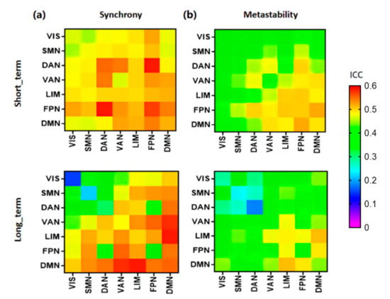 Our research results showed that the test–retest reliability of synchrony was fair on almost all resting-state networks. However, across metastability analyses, the reliability values for DMN, LIM, and VAN were relatively stable and relatively higher than those in other networks. The default-model network had a role as a stable core of mental processing [28,86], which is implicated mostly in internal and goal-directed processing [87,88]. In the resting-state environment, it may not correspond to a large amount of information transfer, and the connection information that already existed in the networks was relatively simple [52]. Namely, this could result in the presence of default-mode network with high test–retest reliability. For the visual network and the somatomotor network, low test–retest reliability was an indication of the high dynamics of metastability across time or intra-individual [89].