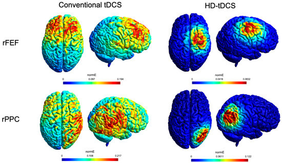 Figure 1. Simulation of the electric field (normE-V/m) performed with SimNIBS. Side and top views of the right posterior parietal cortex (rPPC) and the right frontal eye field (rFEF) are provided for conventional tDCS (left panel) and HD-tDCS (right panel).
