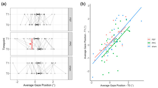 Figure 2. (a) Average gaze position relative to the center of the picture for each stimulation session and timepoint. Bold black lines represent the mean values with the standard errors, while individual performances are depicted with grey lines. The red line represents the significant post-hoc comparisons (pre-post LMM). After PPC tDCS (T1), as compared to its baseline (T0), participants’ gaze position shifted slightly to the left. (b) Regression lines for each stimulation on the baseline performance, as from the “baseline” LMM; * = p = 0.024.