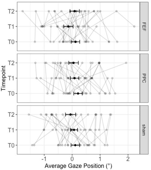 The same statistical approach of Experiment 1 was adopted. Firstly, we performed a “pre-post” LMM with the average gaze position as the dependent variable, predicted by the Stimulation (FEF, PPC, and sham) by Timepoint (T0, T1, T2) interaction, and by the mean number of fixations. Random intercepts were calculated for participants only.