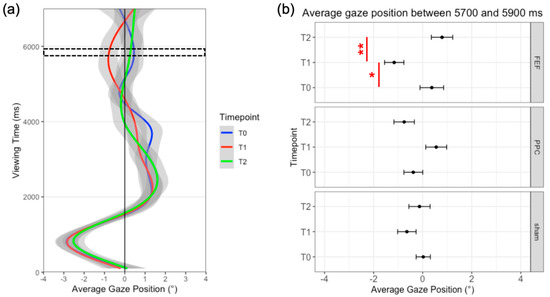 Figure 4. (a) Time-course of visual exploration at different timepoints for FEF HD-tDCS. The black dotted box represents the time window of interest between 5700 and 5900 ms. (b) Average gaze position relative to the center of the picture, between 5700 and 5900 ms, for each stimulation and timepoint. Red lines represent significant differences. Error bars= standard error. * = p < 0.05; ** = p < 0.001.