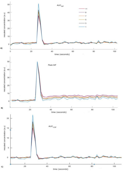 The first rescaling approach referred as scaling by AIF uses concentration curve of a reference AIF as () and concentration curve of selected multivoxel AIF region as () in Equation (5) to estimate the scaling factor k. The second rescaling approach referred as scaling by VOF uses concentration curve of a venous output function (VOF) as and concentration curve of selected multivoxel AIF region as () in Equation (5) to estimate the scaling factor k. The first two rescaling approaches are based on the principle of conservation of time integral of tracer concentration curve C(t) through the vasculature. The third rescaling approach, referred to as scaling by peak, estimates the scaling factor k by matching the peak height of the multi-voxel AIF concentration time curves with the reference concentration time curve. This follows that the multivoxel AIF will have similar characteristics to any other concentration curve in terms of peak height [13].