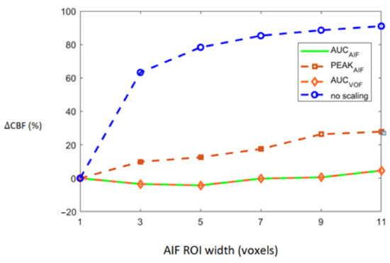 Clinically, AIF selection depends on the expertise, experience, and skill of experts accompanied by time consumption, low reproducibility, and often including tissue signals in AIF. In the past, perfusion studies utilized AIF selection approaches such as slice-specific AIF selection, clustering methods that require ROI to be marked manually prior to AIF extraction [26,27,28,29], and multi stream 3D CNN method [1,30]. No matter what selection strategy is taken, the PVE is always present as the voxels selected may exhibit partial signals. Therefore, a proper approach must be taken to solve the problem. Rescaling of AIF discussed in the present study can be carried out for PVE correction even if the AIF selection procedure is slice specific.