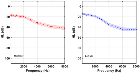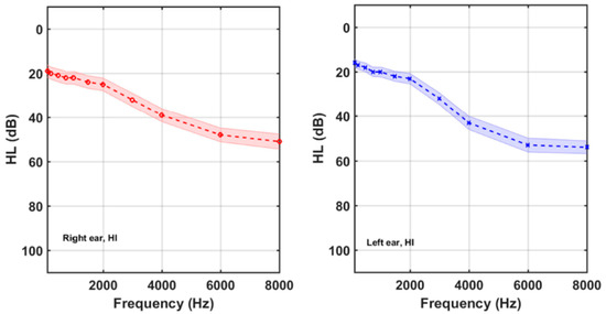 Right and left average audiograms of the 61 participants of the HI subgroup. Shaded areas around the mean curves display the 95% confidence intervals.