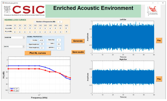 The main goal of sound therapy is to vary auditory processing at the subconscious level to stimulate habituation to tinnitus perception [15]. Numerous sound stimuli have been proposed for tinnitus therapy in the past decades [22,23]. According to Jastreboff and Jastreboff, any type of sound which does not annoy, create discomfort or damage hearing, is better than silence [18]. However, Schaette and Kempter [24] used a computer model of tinnitus-related hyperactivity to show that a personalized sound consisting of broadband noise filtered by the audiometry of the patient should reduce tinnitus optimally. Such a customized broadband sound stimulus was generated by using a custom-designed GUI (Figure 6), consisting of an enriched acoustic environment (EAE) of filtered broadband noise [25]. As the HL curves of both ears are used for filtering the random noise, these stimuli are always stereo, regardless of the ear location of the tinnitus.
