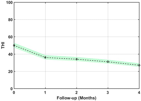 Among the 83 participants completing the study, 80 (96.4%) benefited from the treatment while three failed to get any relief (their THI score even increased by several points). The average THI change over the 4 months of treatment for the 80 successful participants is presented in Figure 7. The average decrease of THI score for these 80 participants was 23 points, which is clinically relevant [14].