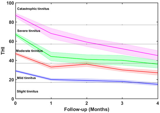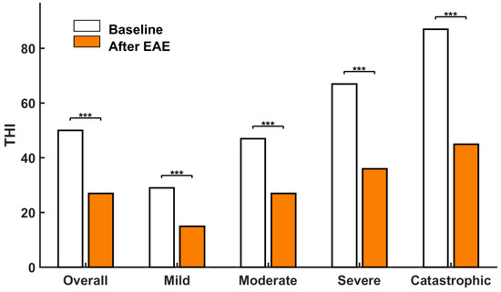 For the mild and moderate scales, the mean THI score was reduced by 14 and 20 points, respectively. However, for the severe and catastrophic scales, much more reductions were obtained (31 and 42 points, respectively).