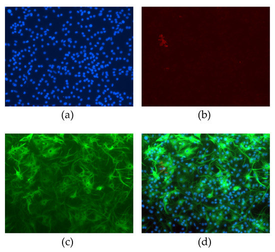 Non-neuronal neonatal cells after magnetic isolation and 15 days cultured in vitro. Cells were stained with (a) DAPI (blue), (b) CD11b (red), or (c) GFAP (green). Panel (d) represents merged images.