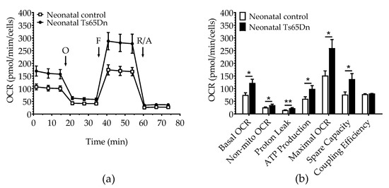 Oxygen consumption in astrocytes derived from neonatal Ts65Dn and control mice. (a) Real-time changes in oxygen consumption rate (OCR) after treatment with oligomycin (O), FCCP (F), and rotenone/antimycin A (R/A) (b) Individual parameters derived from OCR profiles. Basal OCR, nonmitochondrial OCR (Non-Mito), proton leak, ATP-linked OCR, maximal OCR, and spare capacity were significantly increased in astrocytes derived from Ts65Dn neonatal mice compared with those from neonatal control mice. Data are expressed as the mean ± SEM (n = 10–13 independent experiments with samples in triplicate); * p < 0.05, ** p < 0.01.