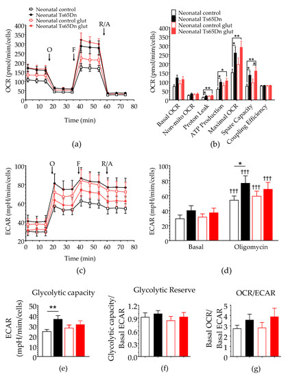 Effect of glutamate stimulation on astrocytic bioenergy in neonatal Ts65Dn and control mice. (a) Real-time changes in oxygen consumption rate (OCR) after treatment with oligomycin (O), FCCP (F), and rotenone/antimycin A (R/A). (b) Individual parameters derived from OCR profiles. Spare respiratory capacity was significantly higher in neonatal Ts65Dn astrocytes compared with neonatal control astrocytes after addition of glutamate. (c) Real-time changes in extracellular acidification rate (ECAR) after treatment with O, F, and R/A. (d) Basal and oligomycin ECAR (ECAR after oligomycin treatment) derived from ECAR profiles. (e) Glycolytic capacity (calculated by subtracting the basal ECAR value from the ECAR value after oligomycin treatment), which did not differ between the groups after glutamate injection. (f) Glycolytic reserve (calculated by dividing the glycolytic capacity by the basal ECAR value and (g) OCR/ECAR ratio. Data are expressed as the mean ± SEM (n = 9–13 independent experiments with samples in triplicate); * p < 0.05, ** p < 0.01, and ††† p < 0.001 indicate differences between before and after treatment for a given genotype.