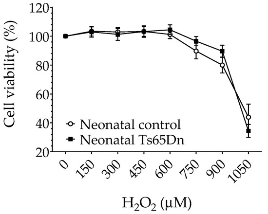 To determine whether neonatal Ts65Dn astrocytes alter their susceptibility to oxidative stress in comparison with neonatal WT astrocytes, we investigated the effect of H2O2 exposure on astrocyte viability using the MTT assay. No differences were found in cell viability between neonatal WT and Ts65Dn astrocytes under our experimental conditions (Figure 5). Although RM-ANOVA showed a significant H2O2 dose dependence (F(6,66) = 35.196, p < 0.0001), no significant genotype dependence (F(1,11) = 0.142, p = 0.71) or interaction between H2O2 concentration and genotype (F(6,66) = 0.842, p = 0.5418) was detected.