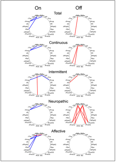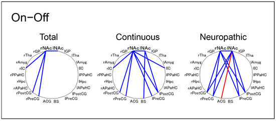 Characteristics of correlation coefficients between the SF-MPQ-2 in the “off” state and FC from “on” to “off” state. Blue lines indicate a significantly negative correlation (<-0.4) and red lines indicate a significantly positive correlation (>0.4). SF-MPQ-2: Japanese version of the revised short-form McGill Pain Questionnaire 2; FC: functional connectivity; r: right; l: left; NAc: Nucleus Accumbens; GP: Globus Pallidus; Tha: Thalamus; IC: Insular Cortex; Amyg: Amygdala; PPaHC: Posterior Parahippocampal Gyrus; Hpc: Hippocampus; APaHC: Anterior Parahippocampal Gyrus; PostCG: Postcentral Gyrus; PreCG: Precentral Gyrus; ACG: Anterior Cingulate Gyrus; BS: Brainstem.