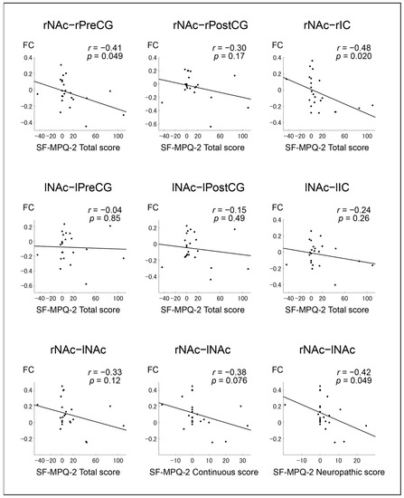 Pearson correlation coefficients and graphs for the correlation of SF-MPQ-2 from “on” to “off” state with FC from “on” to “off” state. The lines indicate the approximate line using the least squares method. SF-MPQ-2: Japanese version of the revised short-form McGill Pain Questionnaire 2; FC: functional connectivity; r: right; l: left; NAc: Nucleus Accumbens; PreCG: Precentral Gyrus; PostCG: Postcentral Gyrus; IC: Insular Cortex.