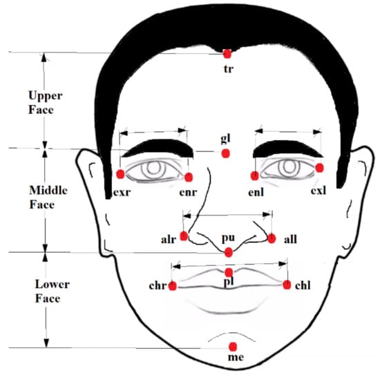 Figure 1 depicts a number of facial landmarks on the three segments of a human face, namely the top face, middle face, and lower face. A specialist scarcity can use the Euclidean distance between the landmarks to determine the degree of face dysmorphology (if any) present in the child. A list of the most essential ASD relevant facial anthropometric measures are included in Table 1. A broader top face, a shorter middle face, wider eyes, a wider mouth, and a philtrum are some of the common facial features seen in children with ASD [16,17]. In a recent study, researchers employed a 3dMD camera to obtain these measurements directly from children; however, the 3dMD camera system is costly, and the method is time-consuming. In our research, we employed machine learning algorithms to extract a variety of facial metrics from each of the training images in a fraction of a second.