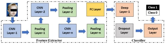 As illustrated in Figure 2, the feature extractor module consisted of a series of convolutional and pooling layers [29,30,31,32]. Convolutional layers are in charge of executing a mathematical operation known as convolution, which is an image filtering technique that aids in the extraction of multiple features from an input image [29,30]. Equation (1) explains the mathematical implementation of the convolution, where f(x, y) is the input image pixel, w(x, y) is the filter mask, and g(x, y) is the resultant output image [32]. Convolution is accomplished by applying a filter mask (of size 3 × 3 or 5 × 5) to each pixel in the input image, yielding a feature map as a result. The dimension (W_conv) of a convolved image corresponds to an input image I of size (height, H x width, W* channels, C), using K filter masks each of size (M rows × M columns), with zero-padding Z and stride S is estimated using the Equation (2). As previously stated, each filter mask has particular weights and biases associated to it, collectively known as learnable parameters, which define the nature of the generated features. Model training begins with some default parameters, which are updated as the workout progresses [31]. The parameters, P_conv of a convolutional layer, are obtained using (3). In practice, an accurate image classifier demands the employment of many filters in order to have the greatest number of distinct features, resulting in a significant increase in the dimension of feature maps. Pooling layers are used to lessen the problem by eliminating redundant data from feature maps. Equation (4) gives the output of a max-pooling layer (W_pool) [32]. The max-pooling layer has no parameters associated with it. The feature extractor module outputs a fully connected layer (FC layer), which is responsible for reshaping the feature map as needed for the classifier module. Equation (5) determines the number of parameters (P_fc) associated with the FC layer with N neurons. Finally, a deep neural network (DNN) classifier is utilized to produce a prediction at the output. An input layer, hidden layers, and an output layer make up the DNN module.