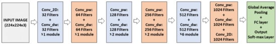 MobileNet is a CNN model designed to perform image classification efficiently on mobile devices, embedded systems, or low-power computers without a GPU [38]. The architecture of the MobileNet model is presented in Figure 3. This model is distinguished from other CNN models by the presence of depth-wise separable filters which combine a depth wise convolution (conv_dw) and pointwise convolution (conv_pw).