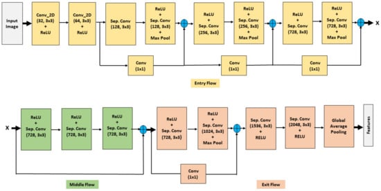 Google’s Inception model inspired the Xception [39] model, and it has a simple and modular architecture. The Xception model has three compartments: entry, middle, and exit, as shown in Figure 4. A linear stack of depth-wise separable convolution layers has been max-pooled with residual connections in each compartment. The input image (standard image size: 299 × 229 × 3) first goes through the entry flow and output X with 19 × 19 × 728 feature maps, as marked in Figure 4. The data X passes through the middle flow eight times and produces a feature map of 19 × 19 × 728 before passing through the exit flow. The output of the exit flow carries 2048 features for a standard size input image. The model has an optional FC layer and logistic regressor, which are not shown in the Figure.