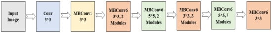 EfficientNet is one of the most efficient models that achieves state-of-the-art accuracy on both image-net and common image classification tasks, as first introduced by Tan and Le in 2019 [40]. EfficientNet has a CNN architecture and scaling method that uses a compound coefficient to uniformly scale the depth/width/resolution dimensions instead of standard practice, which scales these factors arbitrarily. According to intuition, as image resolution improves, the network’s depth and width should also improve. Larger receptive fields can capture similar features that include more pixels in an image as the depth is increased. The EfficientNet has a family of models (B0 to B7 with B0 being a baseline model) representing a good combination of efficiency and accuracy on various scales by introducing a heuristic way to scale the model. The EfficientNet architecture uses mobile inverted bottleneck convolutions in addition to standard convolutions (MBConv) as shown in Figure 5. An MBConv Block is a residual block that uses an inverted structure for efficiency in image classification models. It was first found in the MobileNetV2 CNN architecture and has since been used in several mobile-optimized CNNs.
