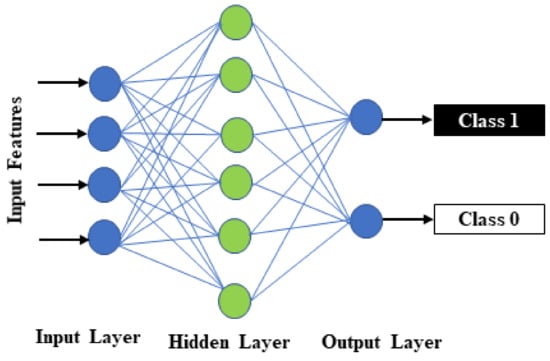 Using the thousands of features gathered by the feature extractor modules, we used a DNN classifier to make predictions. This module has three layers: an input layer that receives features from the previous layer (FC layer), a hidden layer with 256 neurons, and an output layer with a sigmoid activation function to make binary predictions [41]. A dropout layer with a drop rate of 0.5 is added between the dense and output layers to improve the model’s regularization [42]. Figure 6 depicts the various layers and their connections.