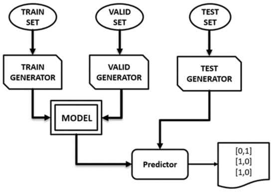 To build any ML model, the empty model must be trained and validated using a dedicated set of train and validation images, respectively. This is followed by testing the model using a set of previously unseen images (test images) in order to estimate the model’s performance. Training and validation datasets contain images with distinct labels indicating the class (autistic or TD) to which each image belongs, while test images lack labels. The trained machine learning model retains critical features extracted from the training images and is capable of accurately predicting the class of any unknown data (new data) using the learned knowledge. As a result, a well-trained machine learning model for ASD screening can accurately predict a child’s class, based on his face photo. As shown in the data flow diagram given in Figure 7, we used three data generators: train generator, validation generator, and test generator, to flow images as batches from the image folder as part of training, validation, and testing of the five proposed ML models. At first, we trained each model using the training set that has 2536 photographs (in two classes), then these model’s performances were validated using 100 photos (in two classes). Finally, we used 300 test images to evaluate the performance of the predictor.