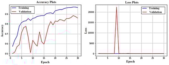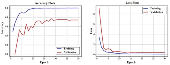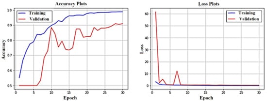 We compiled the models using “Adam” as an optimizer, binary cross-entropy as a loss measure, and accuracy as a metric score. Experimentally, we discovered the following hyper-parameters to be the most effective: The learning rate 0.001, the batch normalization momentum 0.9, the batch size i64, and the number of epochs 30.