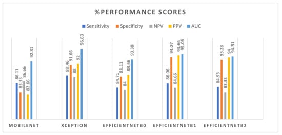 Using Equations (5)–(8), we determined the performance measure sensitivity, specificity, PPV, and NPV for each model on test data, as well as estimating AUC values from ROC curves. Table 2 summarizes the performance scores of the five models used in our research study. We used the MobileNet as a baseline model, with the following scores: 86.11% sensitivity, 83.33% specificity, 86.66% NPV, 82.66% PPV, and 92.81% AUC.